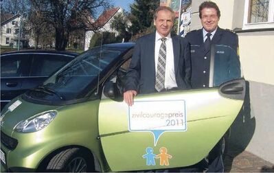 Der Zivilcouragepreis des Landkreises wird am 3. Dezember in Leutkirch verliehen. Lobend hob Baden-Württembergs Innenminister Reinhold Gall (SPD) bei einer Ansprache in Wolfegg die Präventionsarbeit der Polizei hervor. Da sei der Kreis Ravensburg Vorreiter gewesen. Gall forderte dazu auf, Zivilcourage zu zeigen, hinzuschauen und so das Entdeckungsrisiko für die Täter zu erhöhen. Unter dem Motto „Der Landkreis Ravensburg schaut hin“ wird in der Festhalle in Leutkirch der Zivilcouragepreis verliehen. Der Minister ließ sich von Polizeichef Uwe Stürmer (rechts) den Smart vorführen. Mit dem Kleinwagen darf sich der Preisträger ein Jahr lang vergnügen.